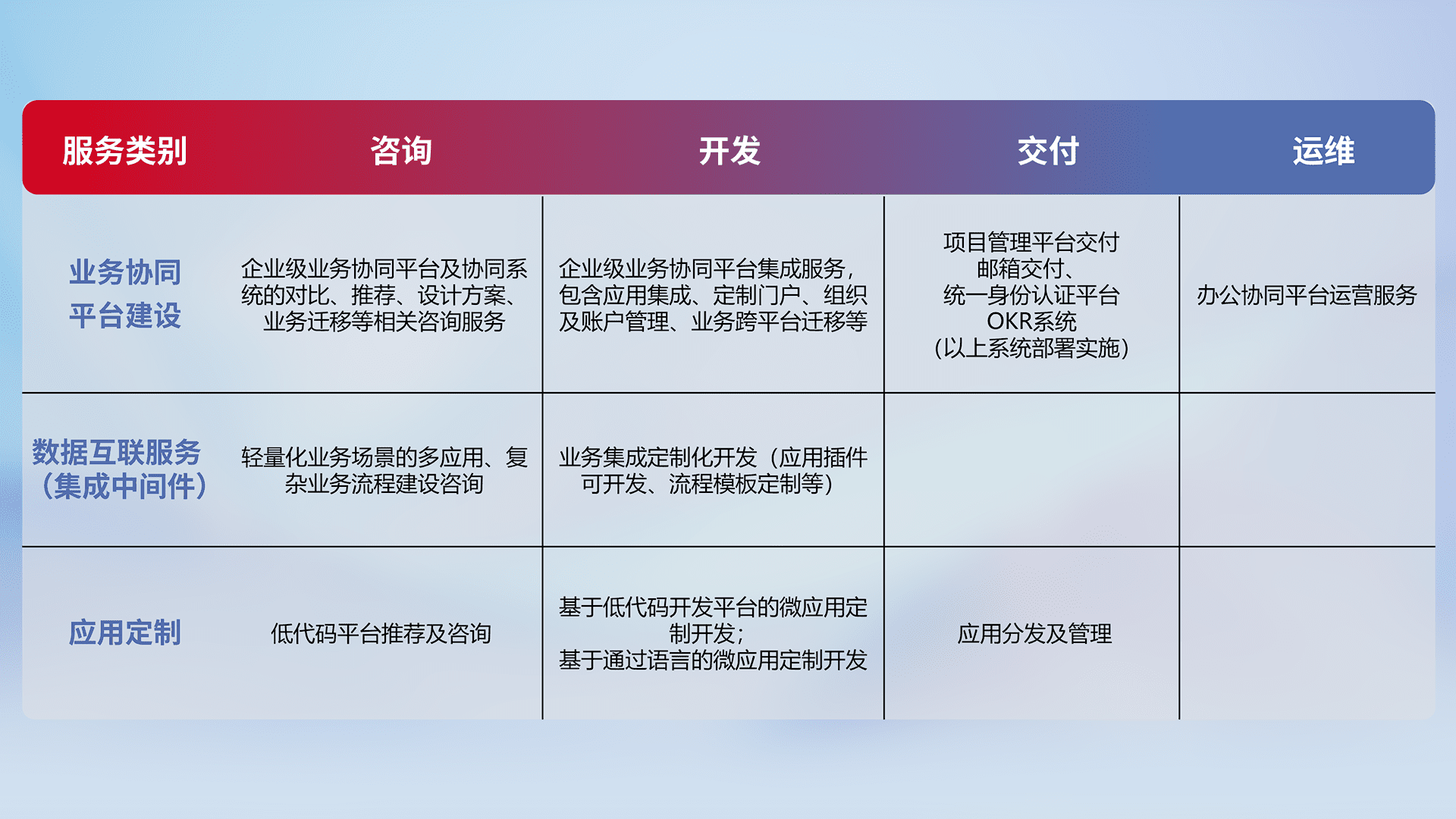 针对钉钉、、、企微、、IDaas等平台级产品提供产品的规划、、方案、、、、交付、、、定制化开发等服务,,,实现如统一协同办公、、、智能客户服务、、、混合会议管理、、、、智能数据查询、、等业务场景,,实现数字化转型。。。。