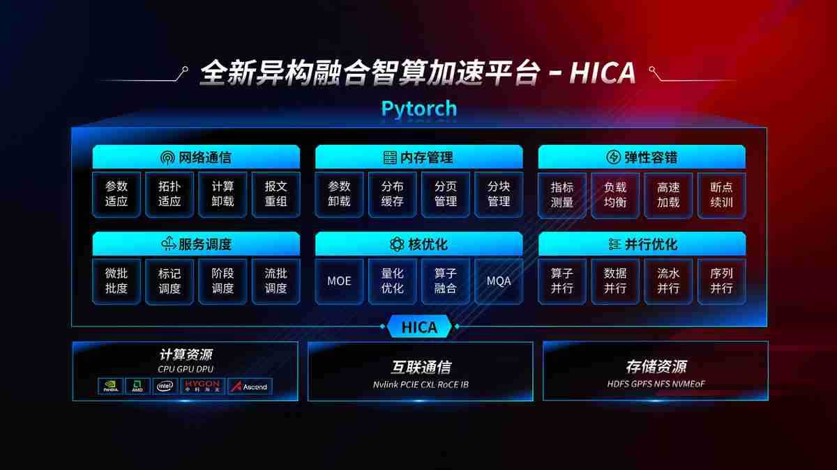 通过自研的服务层、、、中间适配层、、、、以及调度编排算法,,采用数据并行、、、、模型并行等多种并行方式,,,把并行计算任务进行有效的分解,,使其分别由相应的软件栈和算力资源来承接。。。当GPU资源变化,,,HICA可以实时动态调度计算子任务并调整模型拓扑和架构,,以充分聚合各种算力资源。。